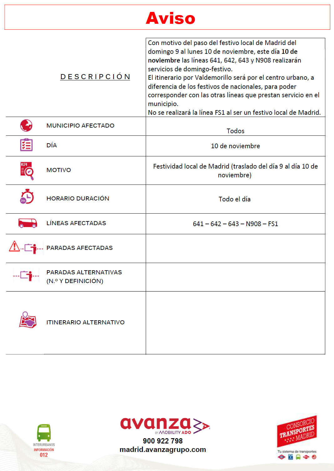 AVISO FESTIVO LOCAL LINEAS VCM-605 y URCM-152